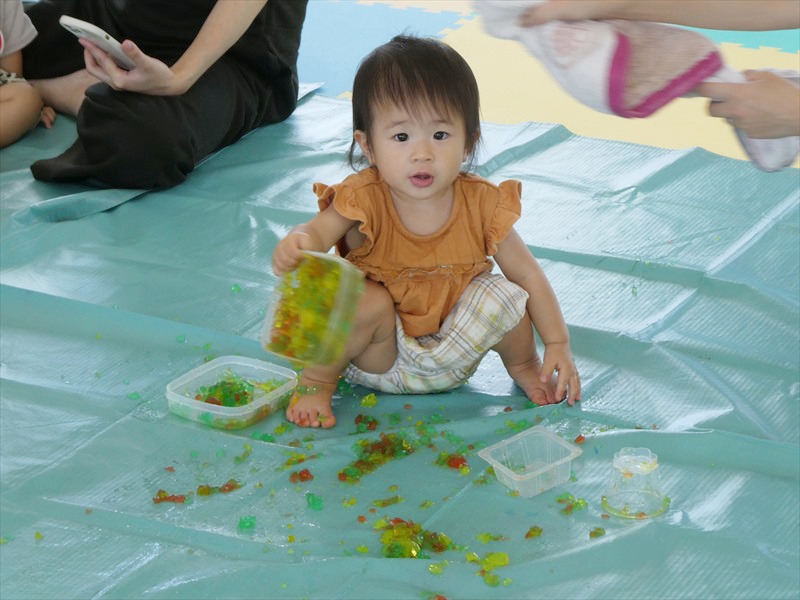 寒天遊びをしました。 冷たい寒天を触ったり握ったりスプーンですくったりしながら思い思い遊んでいました。 「冷たいね」「きれいだね」「気持ちいいね」とお母さんや友達と話したり表情で伝えたりしながら時間いっぱい楽しんでいました。