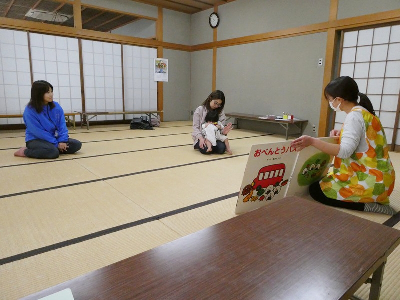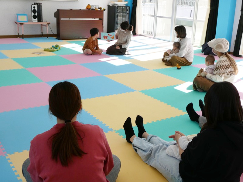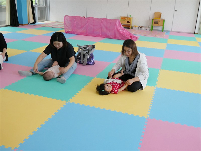 読み聞かせでは、子どももお母さんも集中して見ていました。 ふれあい遊びでは、音楽に合わせてお腹や足などいろいろな所を触ってもらいながら楽しく過ごしていました。
