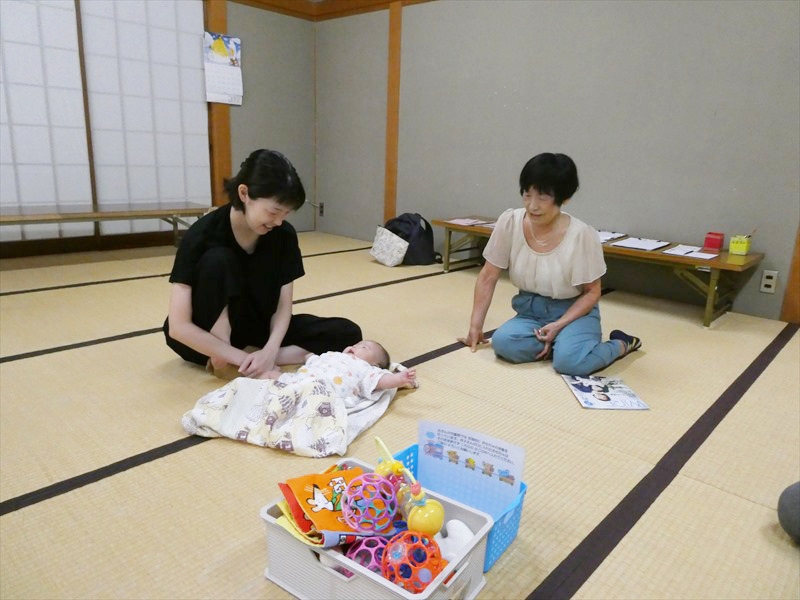 ボランティアの木村さんによる、読み聞かせでは、赤ちゃん達もお母さん達も優しい声に耳を傾け、読み聞かせを楽しんでいました。 リズム遊びでは、お母さんとたくさんスキンシップを取り、たくさんの笑顔が見られました。