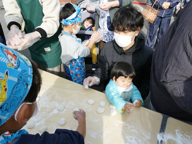 小さいお友達もお家の方と一緒におもちをついたり、丸めたりしました。 初めての体験に戸惑っている子どももいましたが、楽しそうに過ごしていました。 つきたてのおもちも口いっぱいほおばって食べていました。