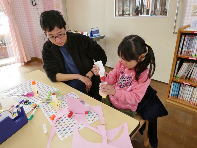 主任児童委員さんと日頃の子育ての話をしたり、一緒に絵本を見たりリズム遊びをしました。 製作で手袋を作りました。小さなシールを一生懸命くっつけようと頑張っている姿が微笑ましかったです。