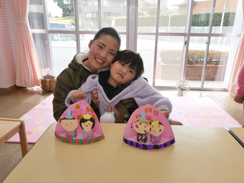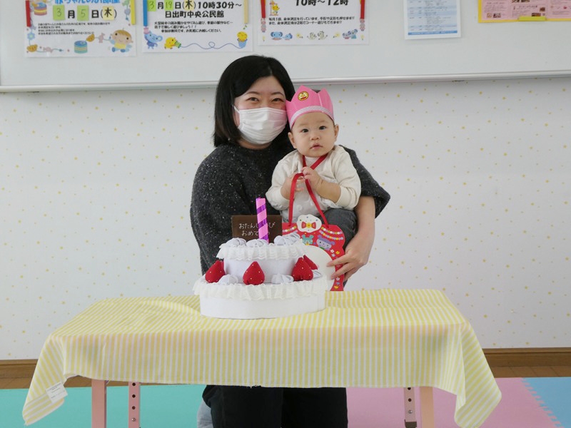 ひな飾り作りをしました。 お母さんに手を添えてもらい、一緒にクレパスでなぐり描きを楽しんだり、シールを貼ったりしてかわいいひな飾りが完成していました。 2月うまれのお友達の誕生会をしました。 上手にケーキの上にろうそくを立てることができました。