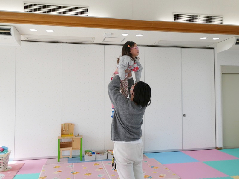 リズム遊びをしました。 お母さんとのスキンシップ遊びに笑顔で体を動かしたり、楽器を鳴らしたりしました。 “たかいたかい”をする時に、子どもの成長を感じているお母さんでした。